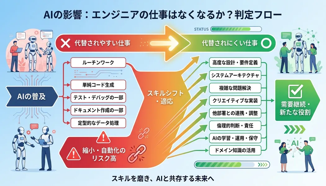 重要なのは「エンジニア全体がなくなるか」という問いではなく、「自分の日々の業務のうち、何が代替可能で何が代替されないか」を具体的に判断することだ。
