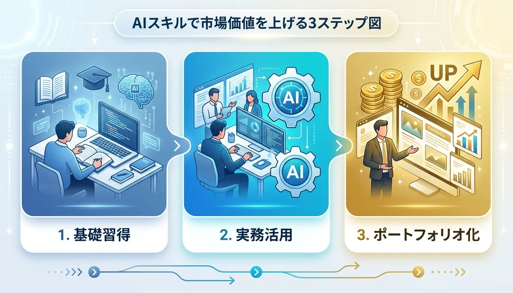 基礎知識 → 実務での活用 → ポートフォリオ化。この3ステップを順番に踏めば、AIスキルは確実に市場価値に変わる。