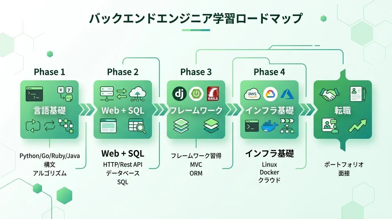 バックエンドエンジニアへの道は、学ぶべき技術が多く見えて途方もない気持ちになりやすい。しかしロードマップを4フェーズに分解すると、それぞれの学習内容と期間は明確だ。