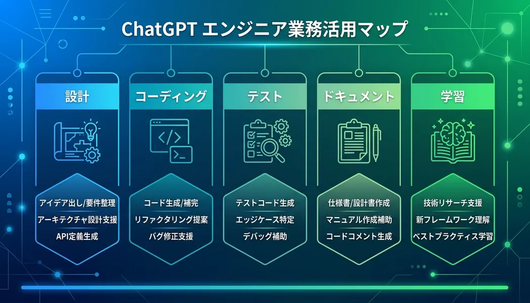 確かにChatGPTはコーディング専用ツールではない。しかし、エンジニアの業務を設計・コーディング・テスト・ドキュメント・学習の5つに分解して考えると、それぞれで活用できる場面が明確に見えてくる。