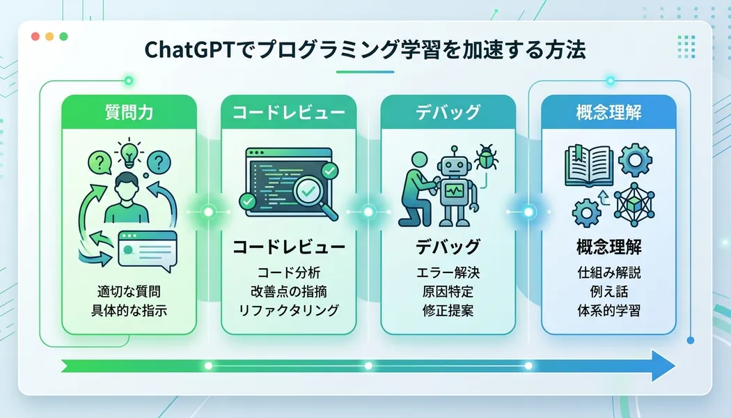 ChatGPTの本当の使い方は、「答えを貰うツール」ではなく「学習の品質を上げるツール」だ。自分で考えたコードをレビューしてもらう、難しい概念を自分の言葉で説明してフィードバックをもらう、詰まったときの仮説を相談する——この使い方にシフトすると、学習速度が変わる。