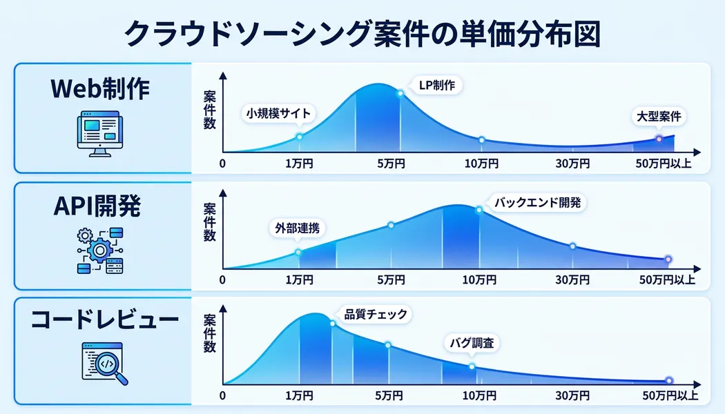 まず市場相場を種別ごとに整理する。以下はランサーズ・クラウドワークス公開案件の2025〜2026年の実態をベースにした数字だ。