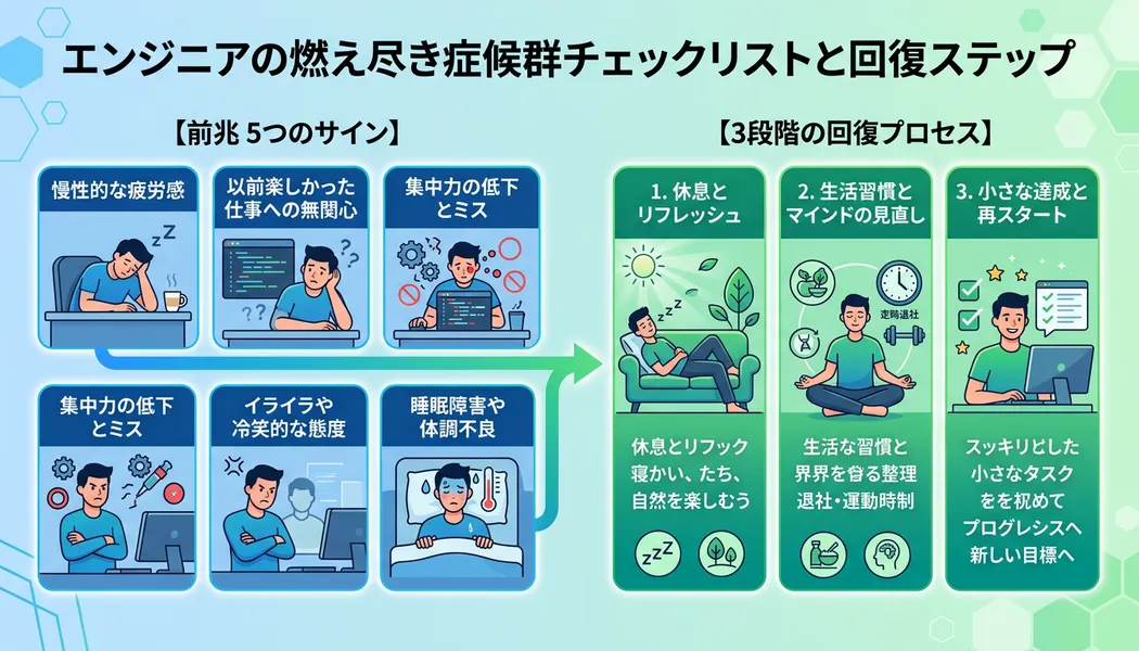 前兆は必ずある:突然燃え尽きるのではなく、チェックリストに当てはまるサインが先に現れる。早期発見が回復期間を大幅に短縮する。