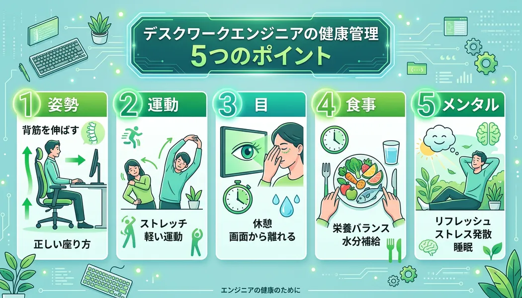 本記事では、エンジニアが知っておくべきデスクワーク健康管理を「姿勢・運動・目・食事・メンタル」の5軸で解説する。今日から始められる具体策を中心にまとめた。