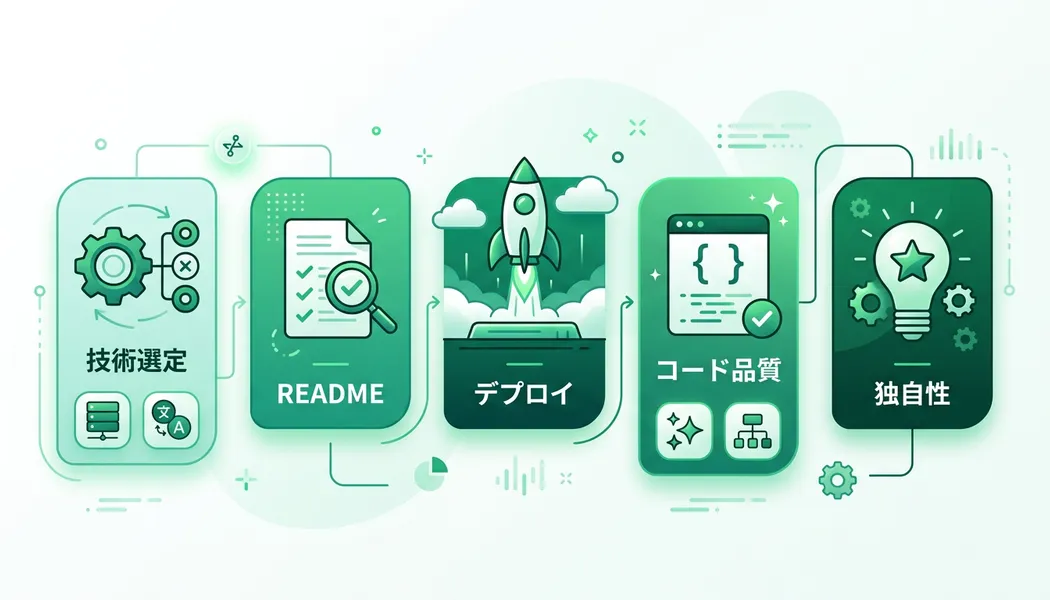 この4点のうち、今の自分のポートフォリオがどこに引っかかっているかを確認してほしい。多くの場合、デプロイとREADMEの2つを整えるだけで通過率は改善する。