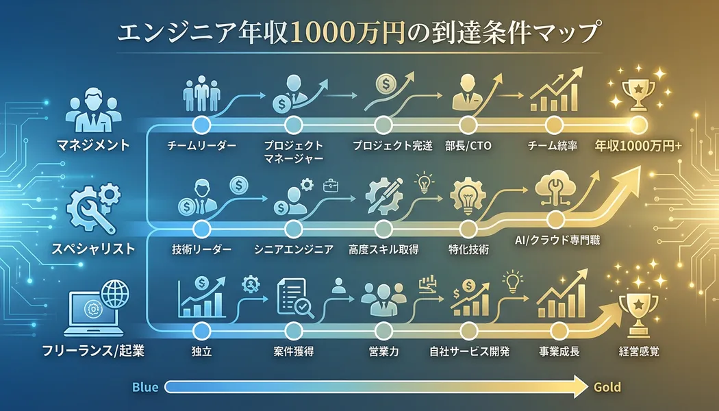 エンジニアの年収1000万円は夢物語ではないが、「エンジニアをやっていれば自然に届く」ものでもない。30代の1.6%という数字が示すように、達成している人は意図的にルートを選んで積み上げてきた。