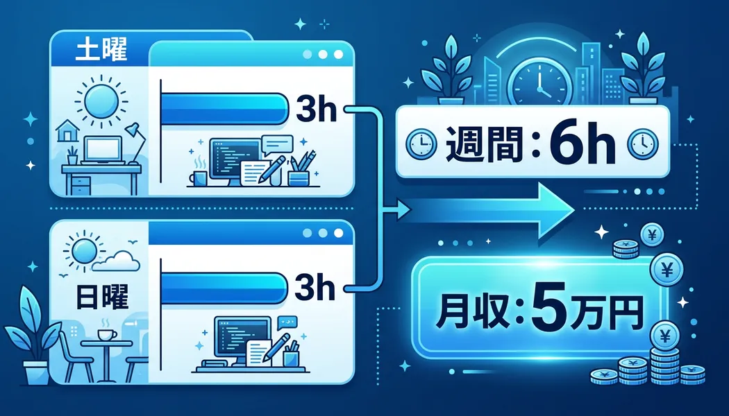 月5万円の目標には、土日各3時間(週6時間)稼働で時給2,000〜3,000円の案件が必要だ。