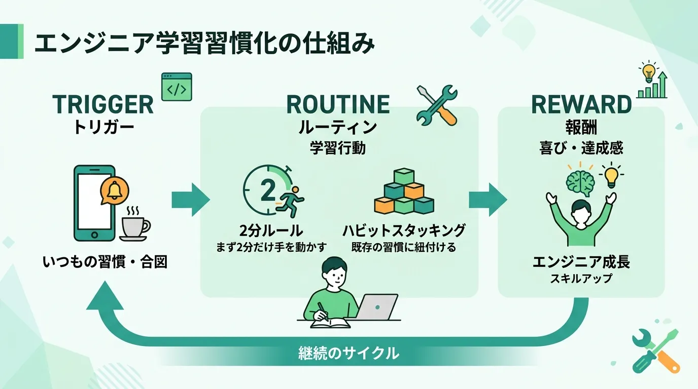 エンジニアの勉強が続かない本質的な原因と、モチベーションに依存しない習慣化の仕組みを整理する。