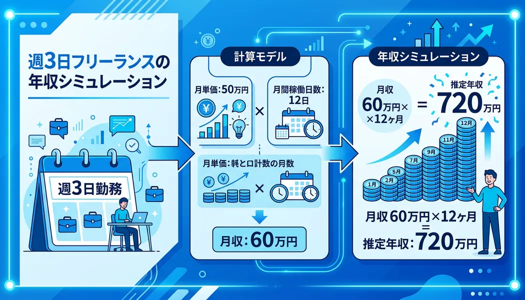 月単価ごとの手取りシミュレーション、週3日案件の見つけ方、週5日からの移行ステップを順番に解説する。