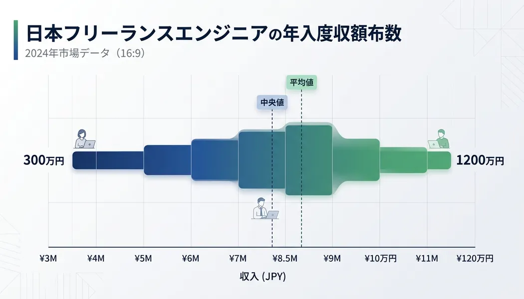 この記事では、フリーランスエンジニアの年収の現実を3つの観点——中央値・手取り計算・初年度の現実——で正直に解説する。