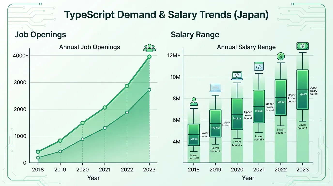 この変化はエンジニアの転職市場にも直接影響している。TypeScriptが書けるかどうかは「付加価値」ではなく「基本要件」になりつつある。では、TypeScriptスキルの転職市場での需要と年収への影響はどうなっているのか、データで確認する。