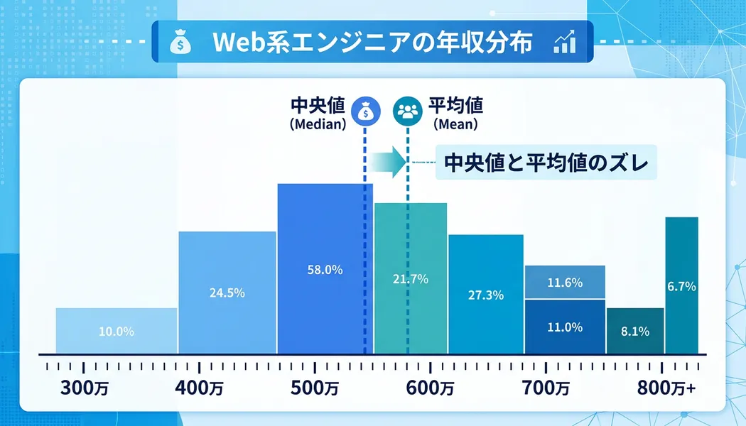 転職情報サイトに載っているWeb系エンジニアの求人を見ると、「年収500万〜800万円」「年収1000万円も目指せる」という数字が並ぶ。しかし現実には、転職直後に年収が下がるエンジニアが一定数いる。